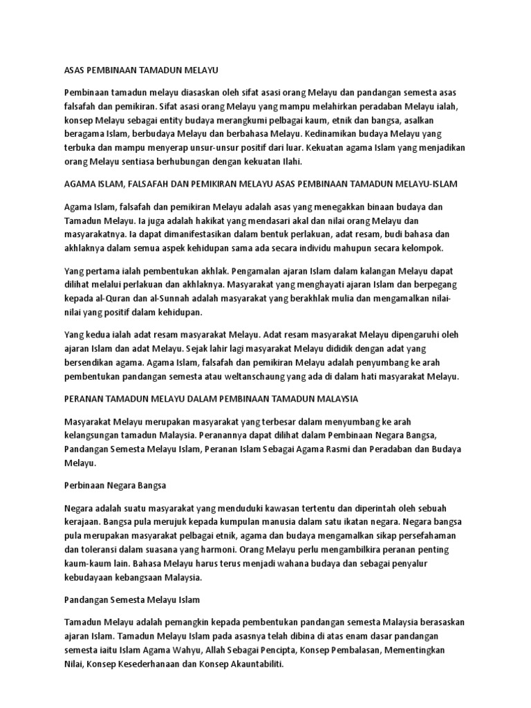 Tamadun melayu memainkan peranan yang sangat penting dalam membina tamadun malaysia. Dalam ajaran islam, prinsip yang berkaitan. 72 konsep ketuhanan impak islam ke atas tamadun melayu sangat kuat. Sistem perundangan tradisional agama islam dan adat istiadat melayu nilai peradaban tamadun melayu hub tmdun melayu dgn tmdun lain kddukan istimewa org mlyu dan bumiputera. Bahasa melayu dijadikan sebagai bahasa lingua franca bagi wilayah kepulauan melayu dan digunakan oleh golongan peniaga serta pengembara asing dari china, eropah dan juga india.