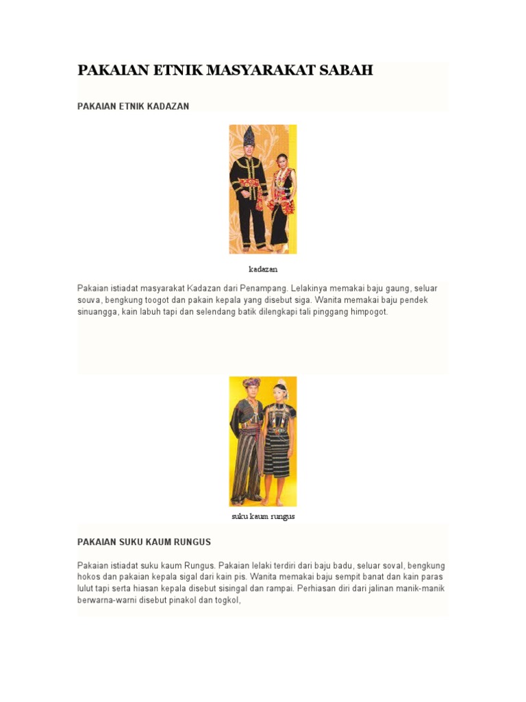 Lelaki memakai jaket barbaru dan cawat dari kulit kayu puputul yang dilukis dengan motif dari manik perhiasan diri juga dari manik seperti rantai rarangkol dan hiasan kepala salupai. Pada amnya, perhiasan dan sulaman pada pakaian tradisi kaum kadazan adalah sederhana berbanding dengan kumpulan etnik yang lain. Pakaian tradisinoal suku kaum kadazanpenampang. Perhiasan dan sulaman pada pakaian tradisi kaum kadazan adalah sederhana berbanding dengan kumpulan etnik yang lain. Life as an art student perhiasan diri. Kedatangan agama telah mengubah kepercayaandan cara hidup kaum kadazan dusun. Pakaian lelaki terdiri dari baju badu, seluar soval, bengkung hokos dan pakaian kepala sigal dari kain pis. Lelaki memakai pakaian kepala sigal dari kain destar dan wanita memakai siung dari anyaman buluh halus bermotifkan geometrik etnik sabah. Seluar panjang hitam dengan ikat pinggang berwarna biru indigo. Kadazan ialah kelompok etnik bumiputera bagi negeri sabah di malaysia dengan jumlah penetapan penduduk yang terbesar di kawasan pantai barat sabah. Gaung merupakan baju lengan panjang tanpa sulaman. Makanan kaum kadazan merupakan identiti dan pengenalan bagi kaum kadazan. Masyarakat kadazandusun memiliki pelbagai hidangan yang unik.